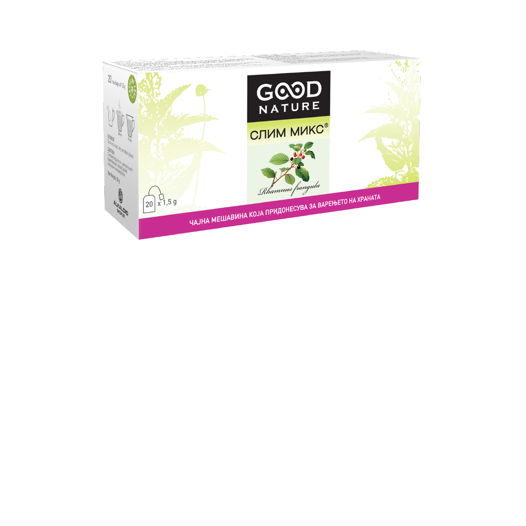 Чајната мешавина „Слим микс“ содржи кора од крушина, која придонесува за работата на цревата и за редовната столица. Коренот од глуварче и слаткиот корен придонесуваат за варење на храната. Мешавината содржи и корен од зајчев трн, цвет од камилица и плод од сладок анасон.